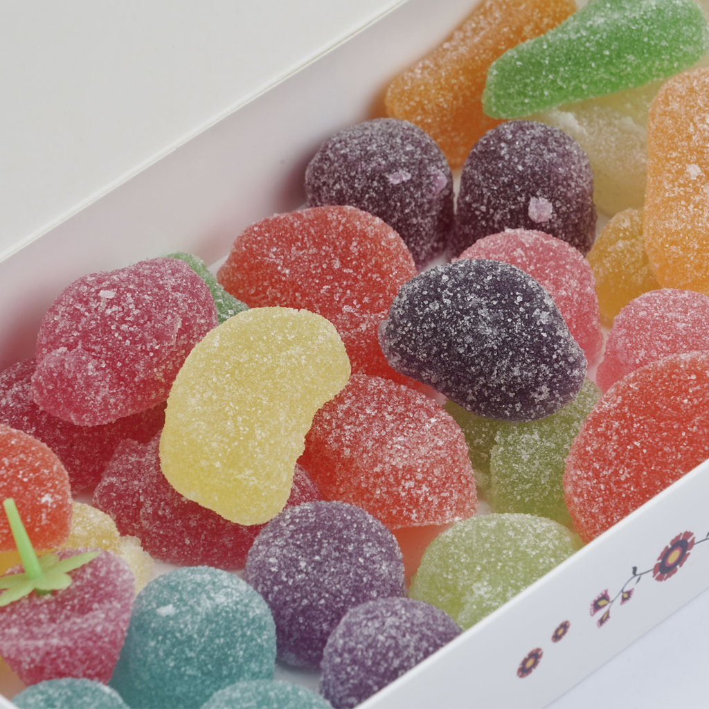 BOMBONES DE FRUTA CONFITADAS: Sabores surtidos: puede contener frambuesa, frutilla, manzana, pera, mora, banana, damasco, naranja, limón, mandarina, ananá, cereza, uva.